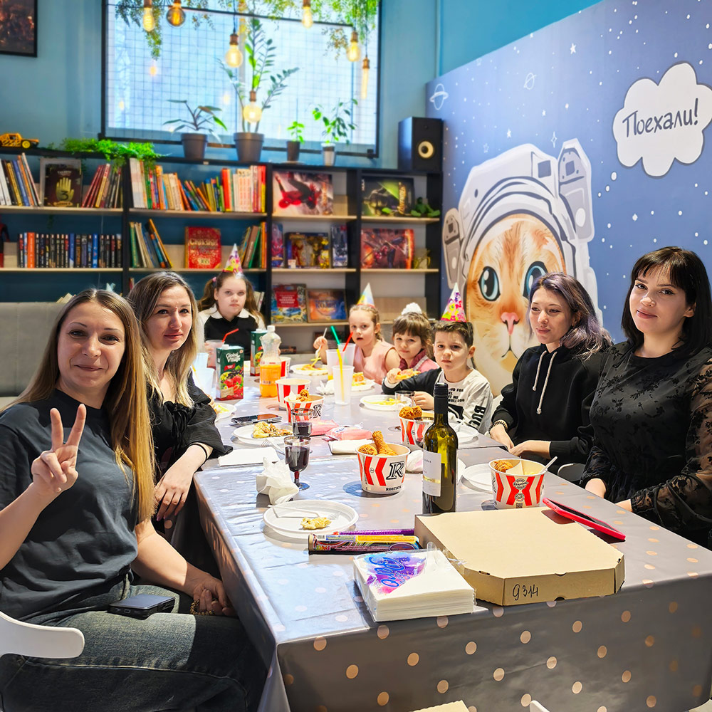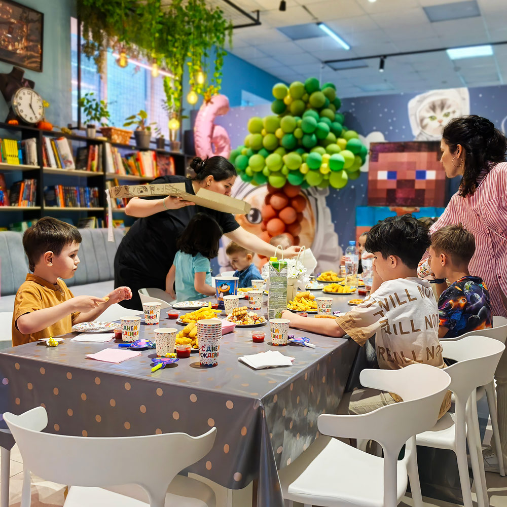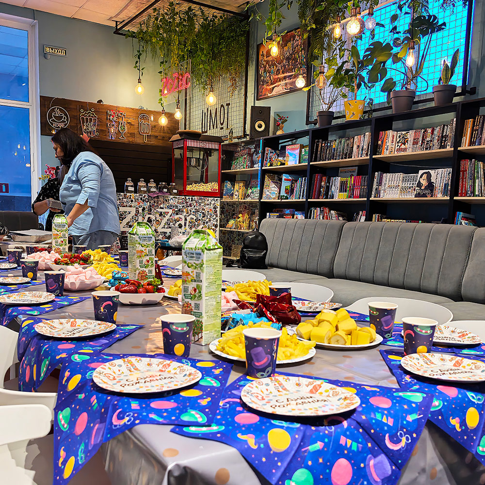 Банкетная зона с мягкими диванчиками, столами, проектором, декорированная книгами и живыми растениями