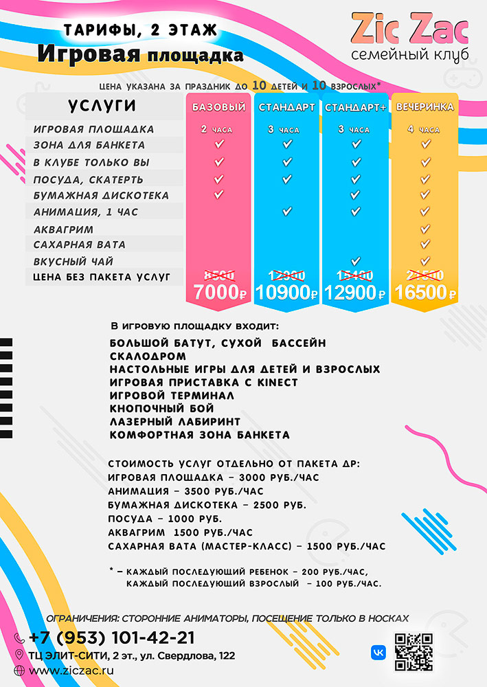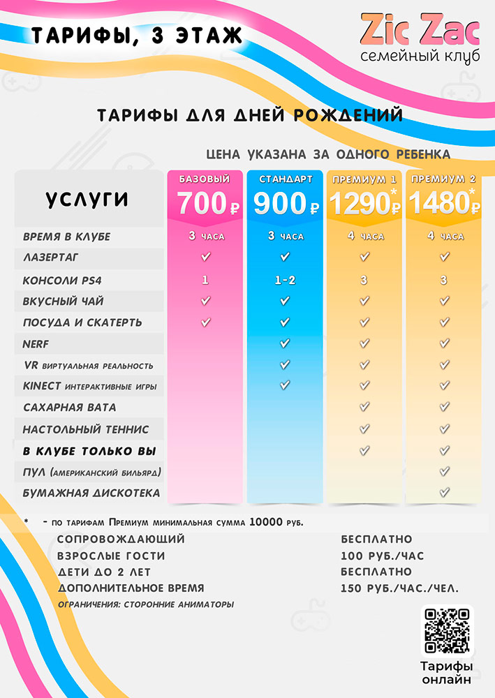 Так же у нас могут действовать специальные тарифы, например, вечерняя игротека. Их мы объявляем в соц. сетях.